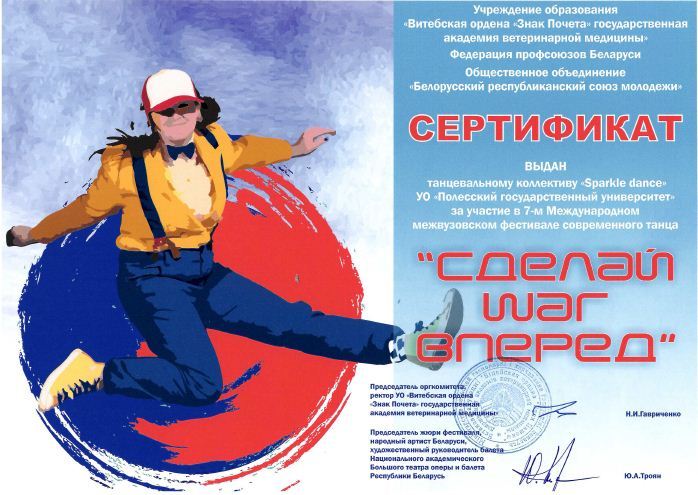 03 - 07 апреля 2017 года студенческий танцевальный коллектив "Sparkle dance" Полесского государственного университета представлял университет на VII Международном межвузовском фестивале современного танца "Сделай шаг вперед!"в г.Витебске.Фестиваля организован был под эгидой Федерации профсоюзов Беларуси и ОО "Белорусский республиканский союз молодежи" и УО "Витебская ордена "Знак почёта" государственная академия ветеринарной медицины".