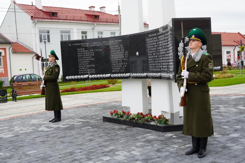 Торжественная церемония возложения цветов у памятника в честь 40-летия освобождения Пинска