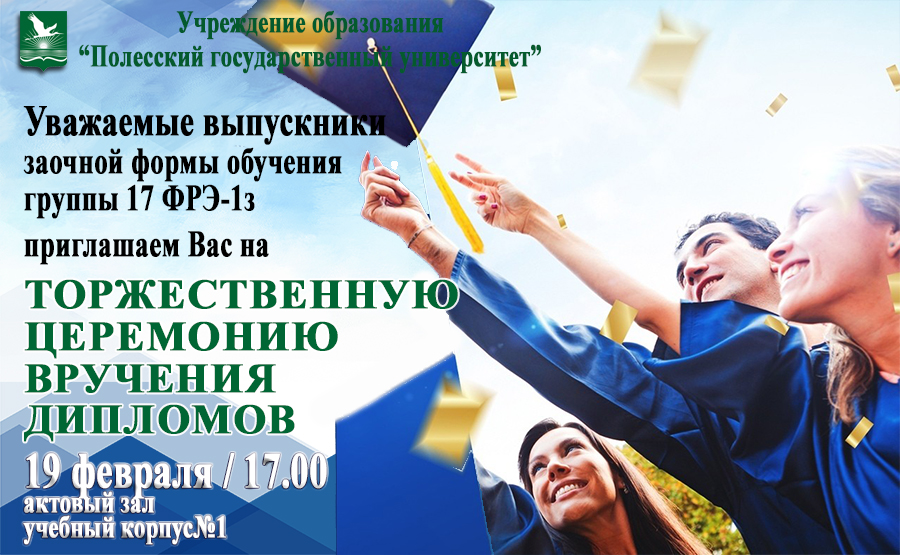 Торжественная церемония вручения дипломов выпускникам заочной формы обучения группы 17 ФРЭ-1з факультета организации здорового образа жизни состоится 19 февраля в 17:00 в актовом зале учебного корпуса №1.