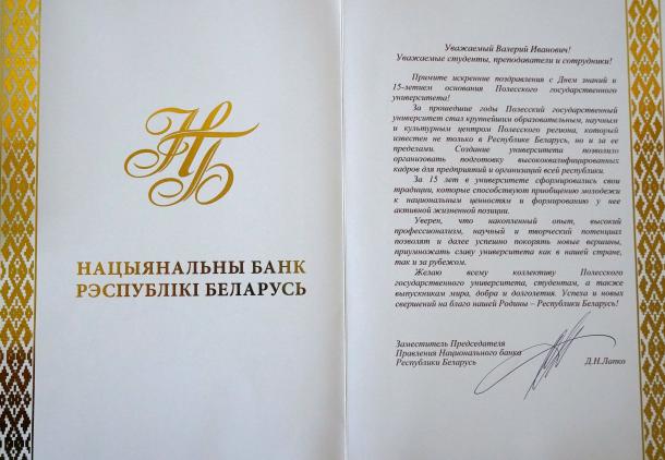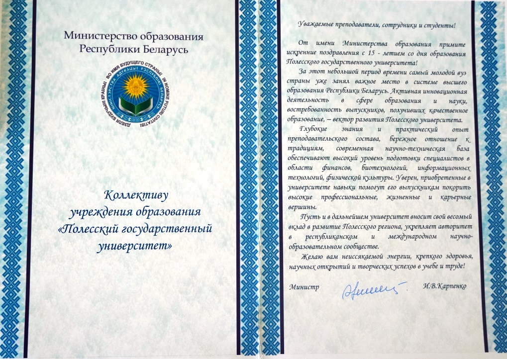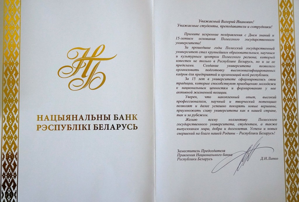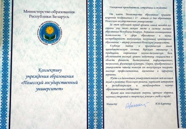 В рамках мероприятий по случаю Дня знаний и начала учебного года, а также 15-летия ПолесГУ, состоялся торжественный концерт. Университет принимал поздравления, пожелания и подарки от почетных гостей и партнеров. Первый заместитель Министра образования Республики Беларусь Старовойтова Ирина Анатольевна представила Поздравительный адрес Министра образования Республики Беларусь Карпенко Игоря Васильевича, в котором были выражены искренние пожелания процветания и успеха университету.