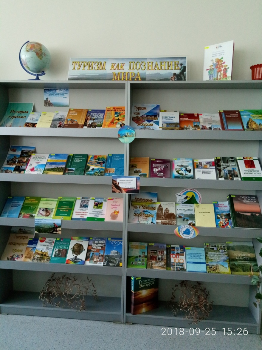 В читальном зале библиотеки (учебный корпус №3 ауд. 3332) экспонируется книжная выставка «Туризм как познание мира», посвященная Всемирному дню туризма. На ней представлены учебники, учебные и учебно-методические пособия, монографии по истории туризма, экскурсоведению, страноведению и краеведению; в отдельной рубрике выделены виды туризма - внутренний и международный, культурный и религиозный, экологический и зеленый, спортивный и лечебный, образовательный, рекреационный, оздоровительный и другие. В рубрике «Краеведение как путь к познанию своей Родины» размещена информация о культурно-историческом и природном наследии Беларуси.