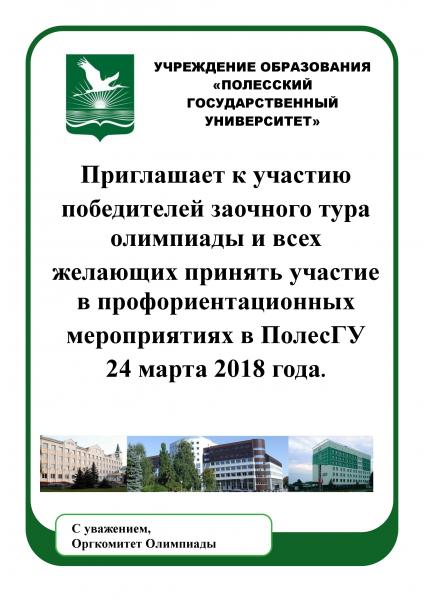 Полесский государственный университет приглашает победителей заочного тура олимпиады принять участие во втором (очном) туре Олимпиады по общеобразовательным и специальным дисциплинам.