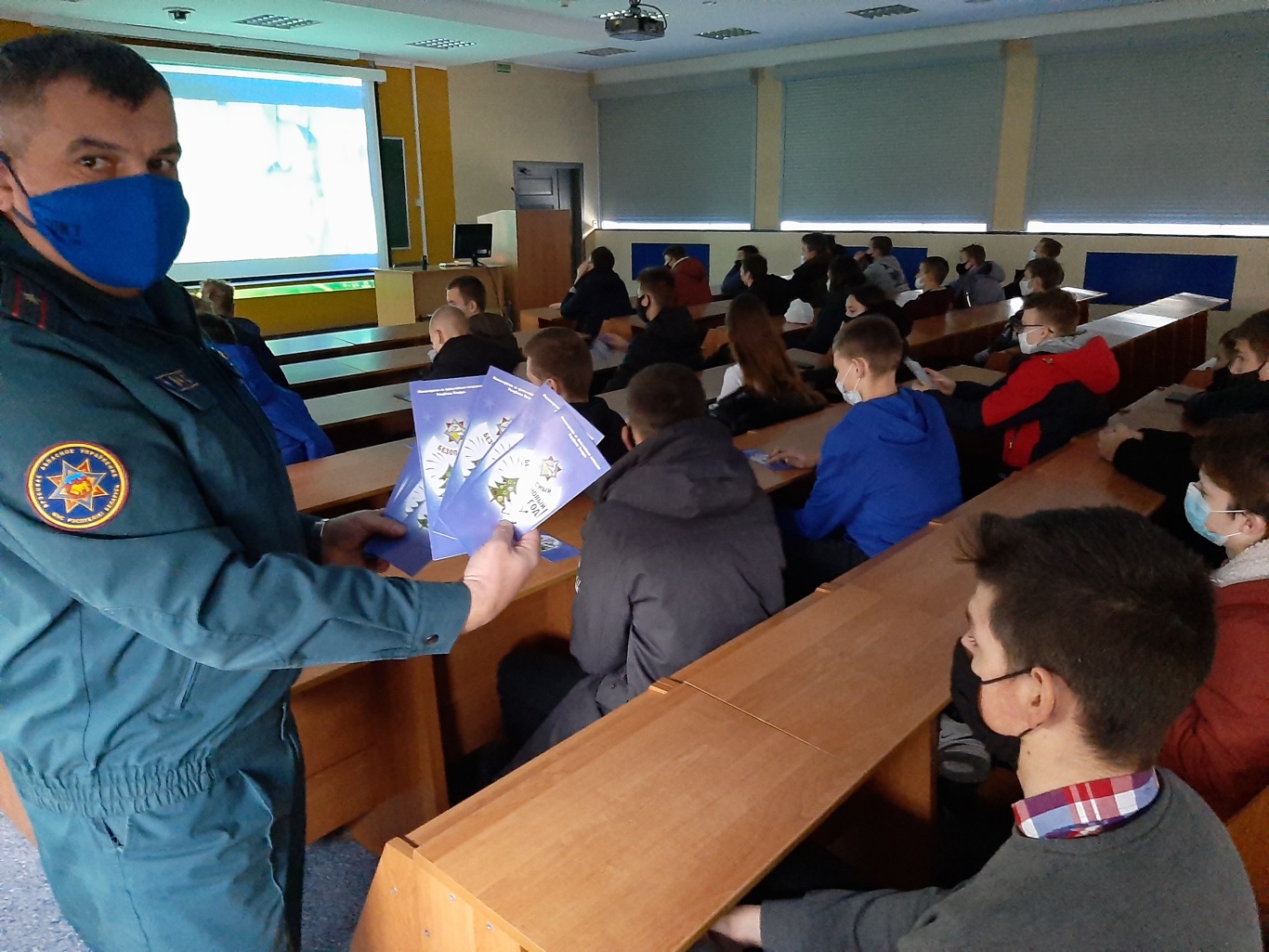 В ходе урока представители Пинского ГРОЧС продемонстрировали десятиклассникам несколько тематических видеофильмов, а также вручили информационные буклеты «Безопасный Новый год».