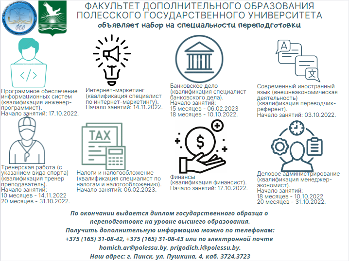 Подача заявления на обучение – каб. 3723, 3725 или по электронной почте homich.ar@polessu.by, prigodich.i@polessu.by.