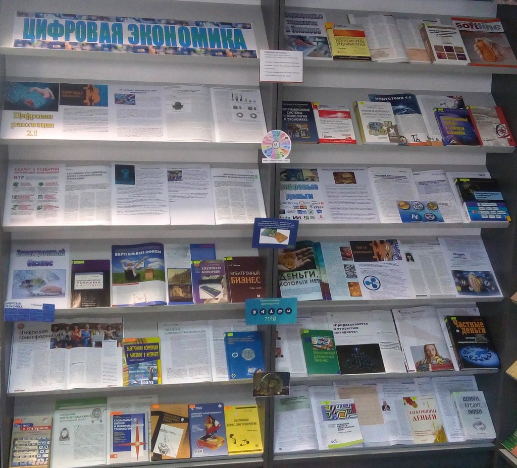 На выставке представлены энциклопедии, периодические издания, учебные пособия по экономической деятельности, основанной на цифровых технологиях, связанной с электронным бизнесом и электронной коммерцией, а так же рассмотрены современные тенденции развития электронных денег в цифровой экономике.