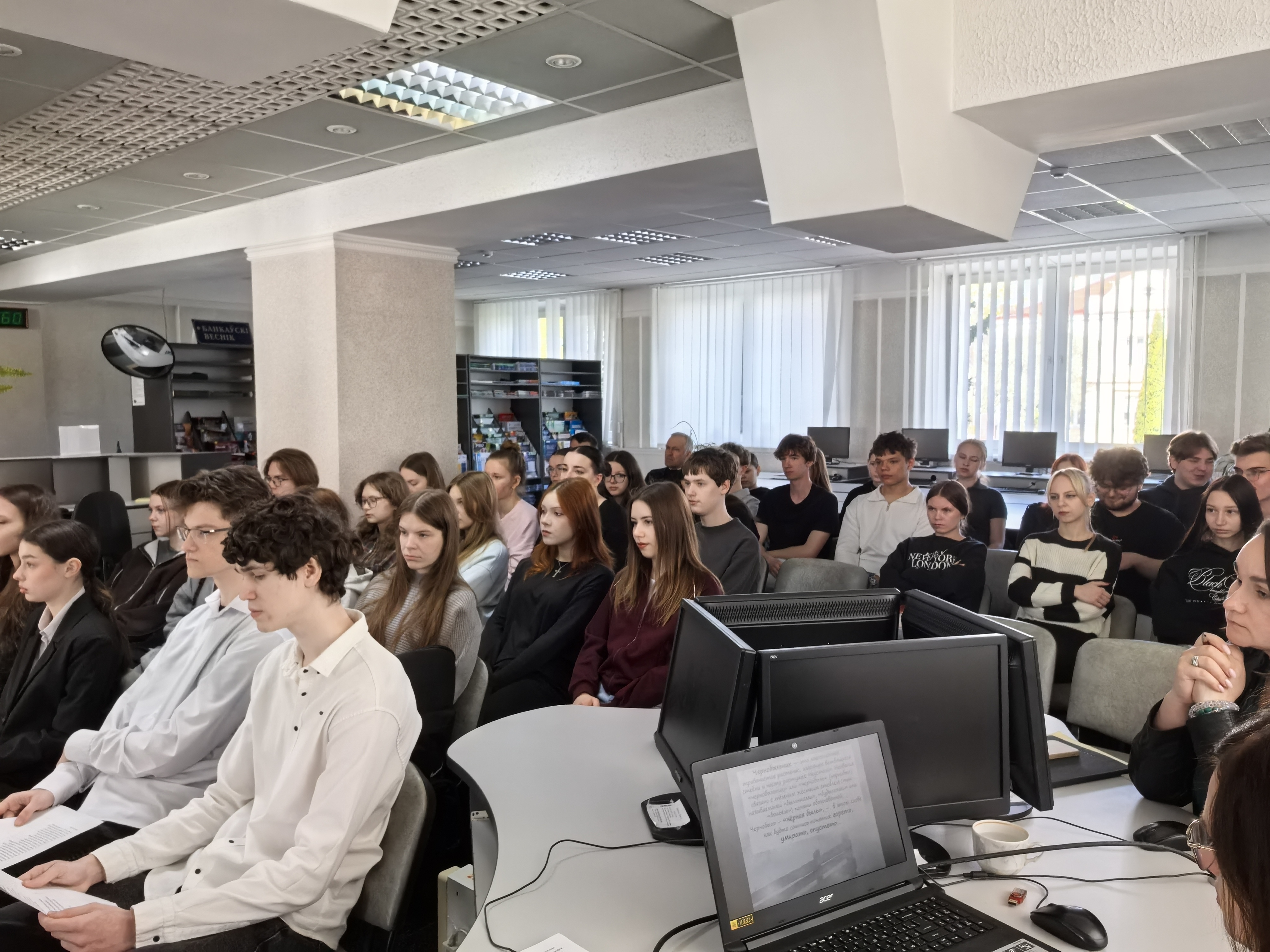 23 апреля 2026 года в читальном зале библиотеки учебного корпуса №1 библиотекарем 1 категории Рыбчинской Аллой Андреевной совместно со студентами экономического факультета был проведен час информации «Чернобыль: трагедия, подвиг, память», который был приурочен к этой трагичной памятной дате. Участниками встречи стали студенты групп 25ИЭ-1 и 23БА-1. Ведущие мероприятия Демяник Андрей и Кабычкина Елизавета простыми, но проникновенными словами описали хронологию тех страшных дней: взрыв на четвёртом энергоблоке, пожар, выброс огромного количества радиоактивных веществ в атмосферу. Они напомнили гостям, что последствия аварии могли быть неизмеримо страшнее, если бы не самоотверженность первых участников ликвидации – пожарных, работников станции, врачей. Именно ликвидаторы, не жалея себя, приняли на себя первый и самый мощный удар радиации. Особое внимание было уделено подвигу простых людей, которые ценой своего здоровья и жизни предотвратили дальнейшее распространение радиации.