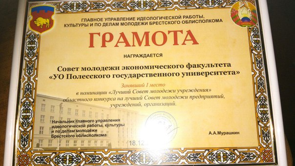 Студенческий совет экономического факультета Полесского государственного университета характеризуется своей сплоченностью, организованностью, ответственностью, умением планировать и реализовывать в жизнь самые смелые проекты. Это признали на городском и областном уровне. По итогам работы студсовет экономического факультета занял почетное 1-е место в рамках городского конкурса на  лучший Совет молодежи предприятий, учреждений и организаций. Участие в областном конкурсе также стало результативным: 18 декабря 2015 года, в рамках торжественного закрытия года молодежи Брестской области, было организовано награждение победителей конкурса на лучший Совет молодежи предприятий, учреждений и организаций. У студсовета экономического факультета под руководством Антошука Виктора – 1 место! Деканат экономического факультета от всей души поздравляет студенческий совет  факультета, декана - Зборину Ирину Михайловну и  куратора совета , заместителя декана по воспитательной работе - Микелевич Елену Болеславовну и желает дальнейших успехов!