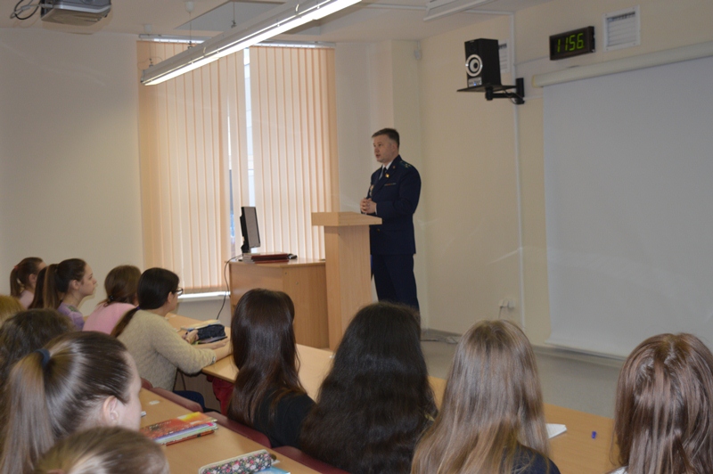 07.02.2018 состоялась встреча студентов факультета банковского дела с Кравчуком Русланом Ивановичем, прокурором Пинской межрайонной прокураторы и проректором университета Власовой Светланой Викторовной. В ходе встречи Руслан Иванович проинформировал об основных направлениях деятельности прокуратуры, подчеркнув, что работа основывается на требованиях Закона Республики Беларусь «О прокуратуре Республики Беларусь», согласно которого основными задачами прокуратуры являются обеспечение верховенства права, законности и правопорядка, защита прав и законных интересов граждан и организаций, а также общественных и государственных интересов. Руслан Иванович также уделил особое внимание основным изменениям в законодательстве, связанным с профилактикой семейного насилия, профилактикой распространения наркомании, напомнил студентам о необходимости соблюдения информационной безопасности в сети интернет. На встрече были также обсуждены вопросы предстоящих выборов в местные Советы депутатов двадцать восьмого созыва, разъяснены права и обязанности избирателей.