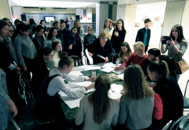 В завершении мероприятия состоялась торжественная передача республиканской выставки студенческого творчества ”ГРАНИ ТВОРЧЕСТВА“ представителям учреждения образования ”Брестский государственный университет имени А.С.Пушкина“ в форме символичного вручения картины написанной на АРТ-уроке ”Палитра Полесья“.
