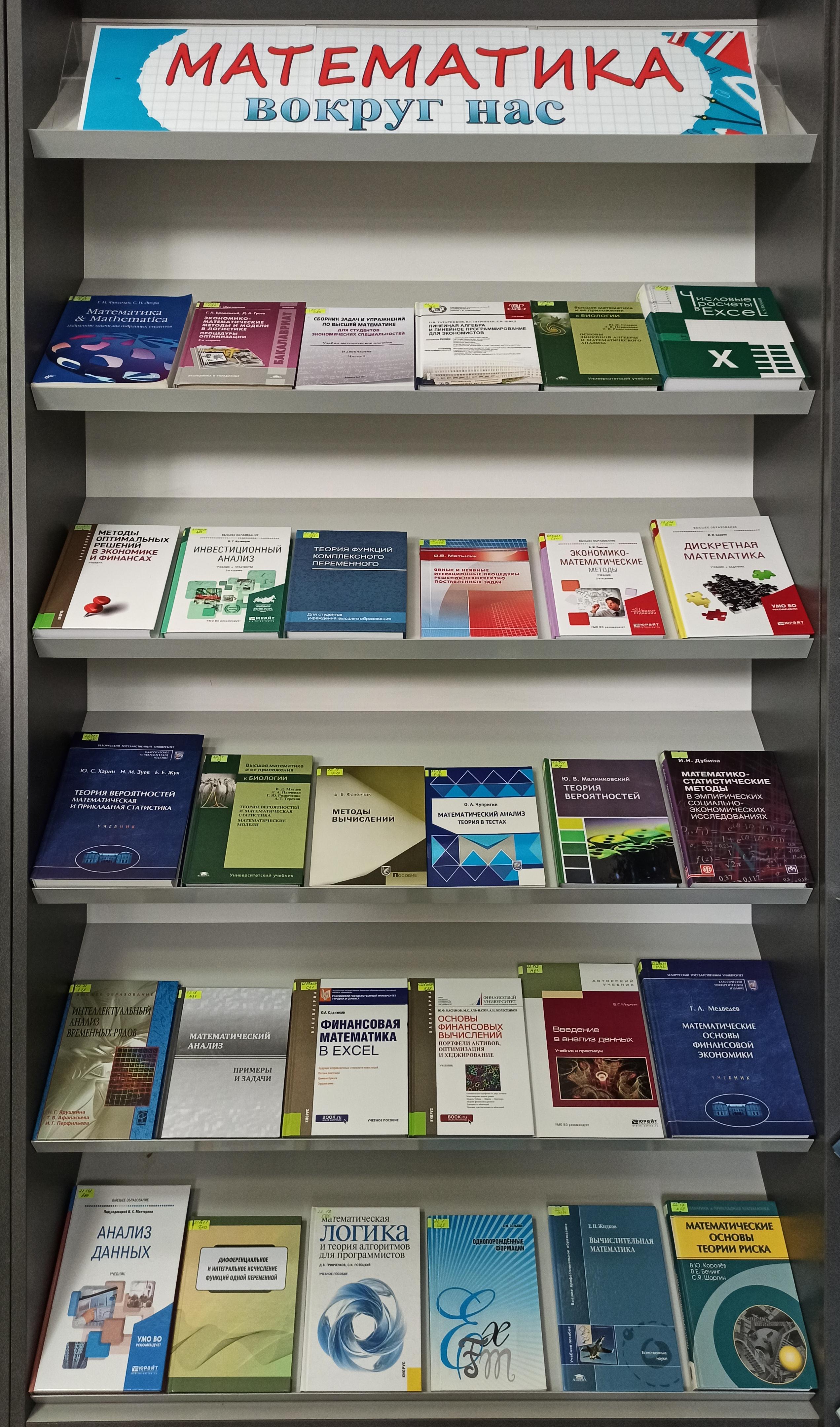 В читальном зале учебного корпуса №1 к этой дате организована книжная выставка «Математика вокруг нас», на которой представлены книги, где показана роль математики в повседневной жизни людей и ее связь с различными областями знаний, с различными профессиями.