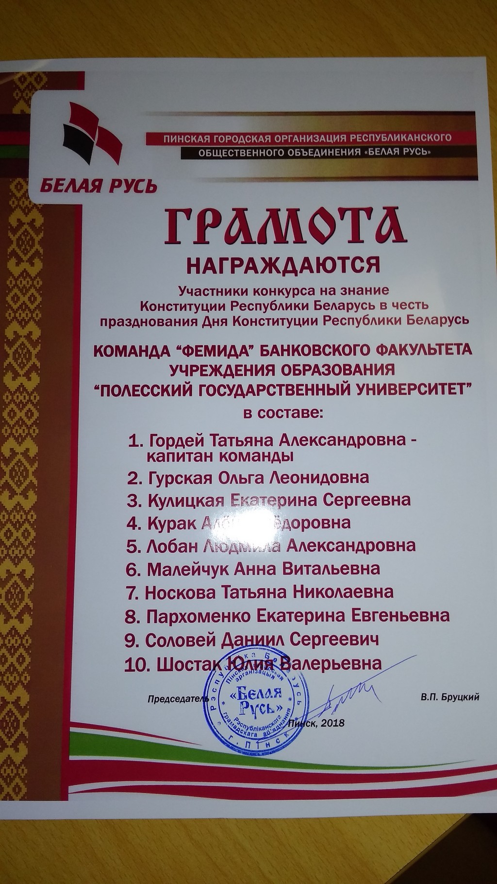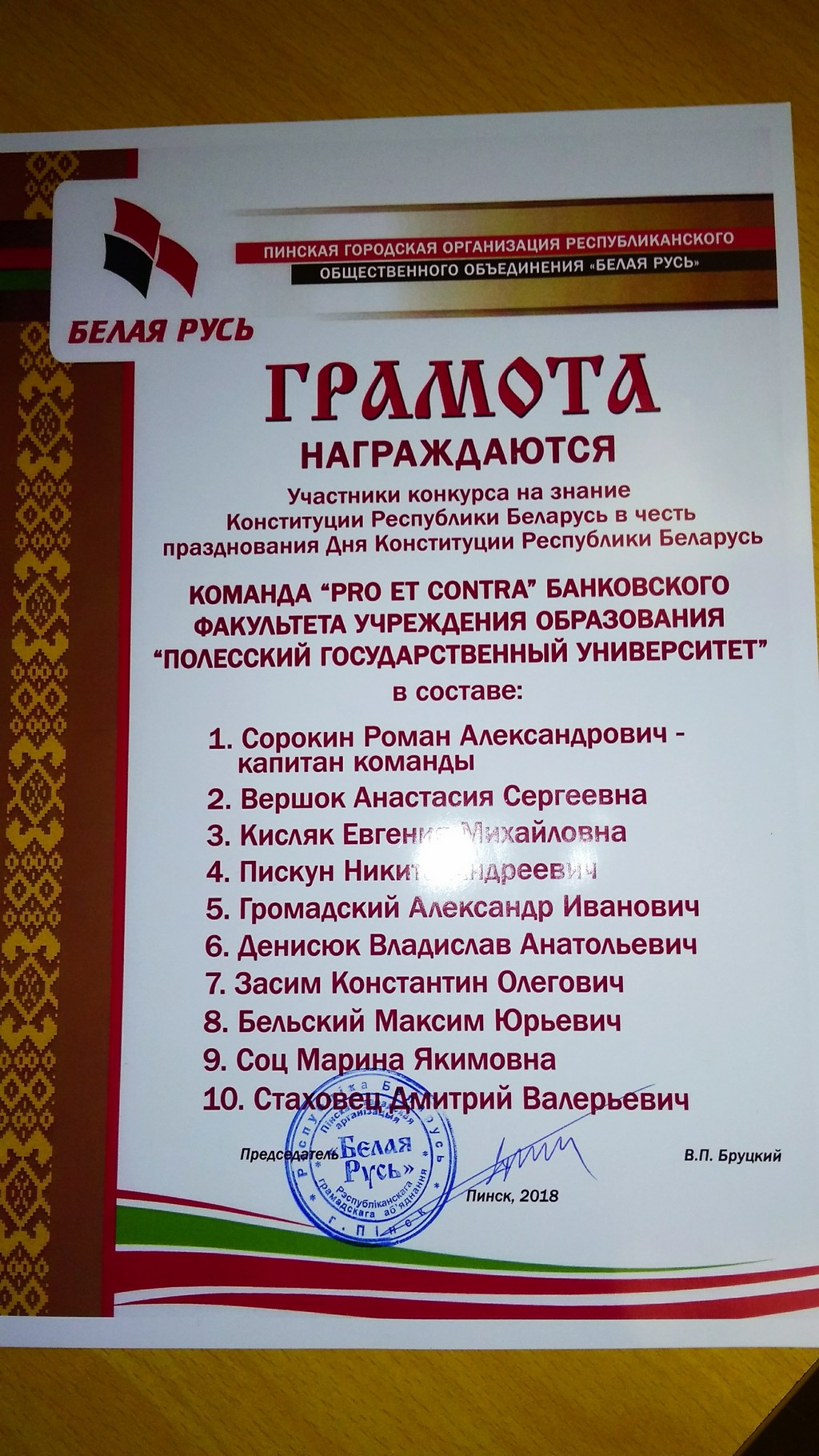 Ответы студентов оценивало авторитетное жюри в составе председателя Пинской ГОРОО «Белая Русь» Бруцкого Виктора Павловича, экспрокурора Пинского района и города Пинска, в настоящее время адвоката Андриевича Алексея Михайловича, начальника отдела воспитательной работы с молодежью университета Приборович Екатерины Александровны.