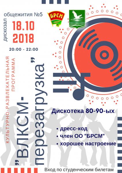 Культурно-развлекательная программа "ВЛКСМ - перезагрузка", посвящённая 100-летию ВЛКСМ (Всесоюзный Ленинский коммунистический союз молодёжи). «Дискотека СССР» — это музыка высокой жизненной энергии, позитива и прекрасного настроения