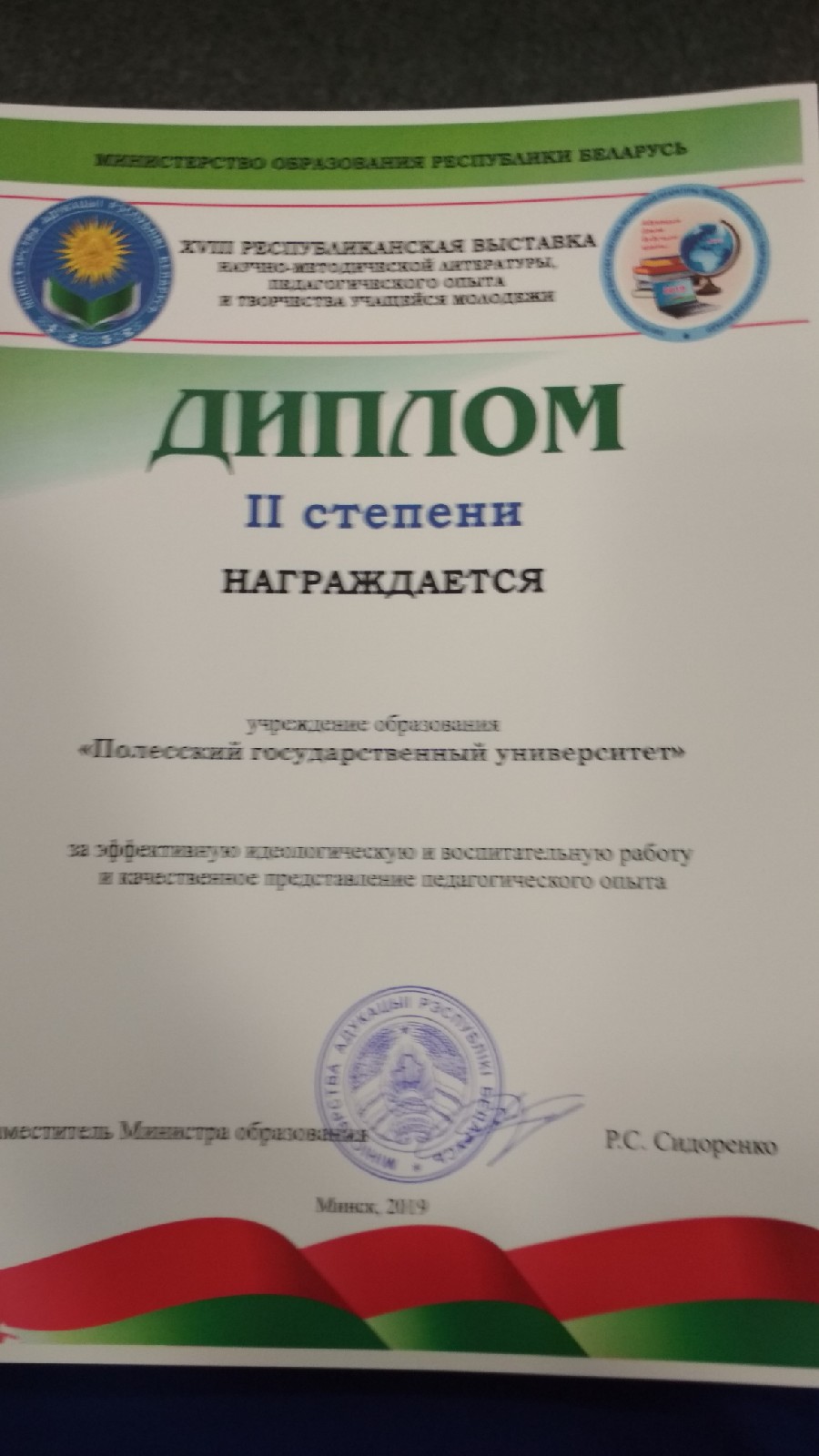 19 апреля 2019 года в г. Минске состоялась церемония закрытия XVIII Республиканской выставки научно - методической литературы, педагогического опыта и творчества учащейся молодежи в рамках Года малой родины. Студенты университета своими яркими номерами выразили любовь всех сотрудников и учащихся вуза к Alma mater. По итогам проведения выставки коллективная работа студентов и сотрудников университета была отмечена дипломом второй степени.