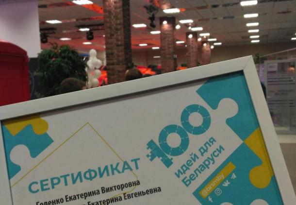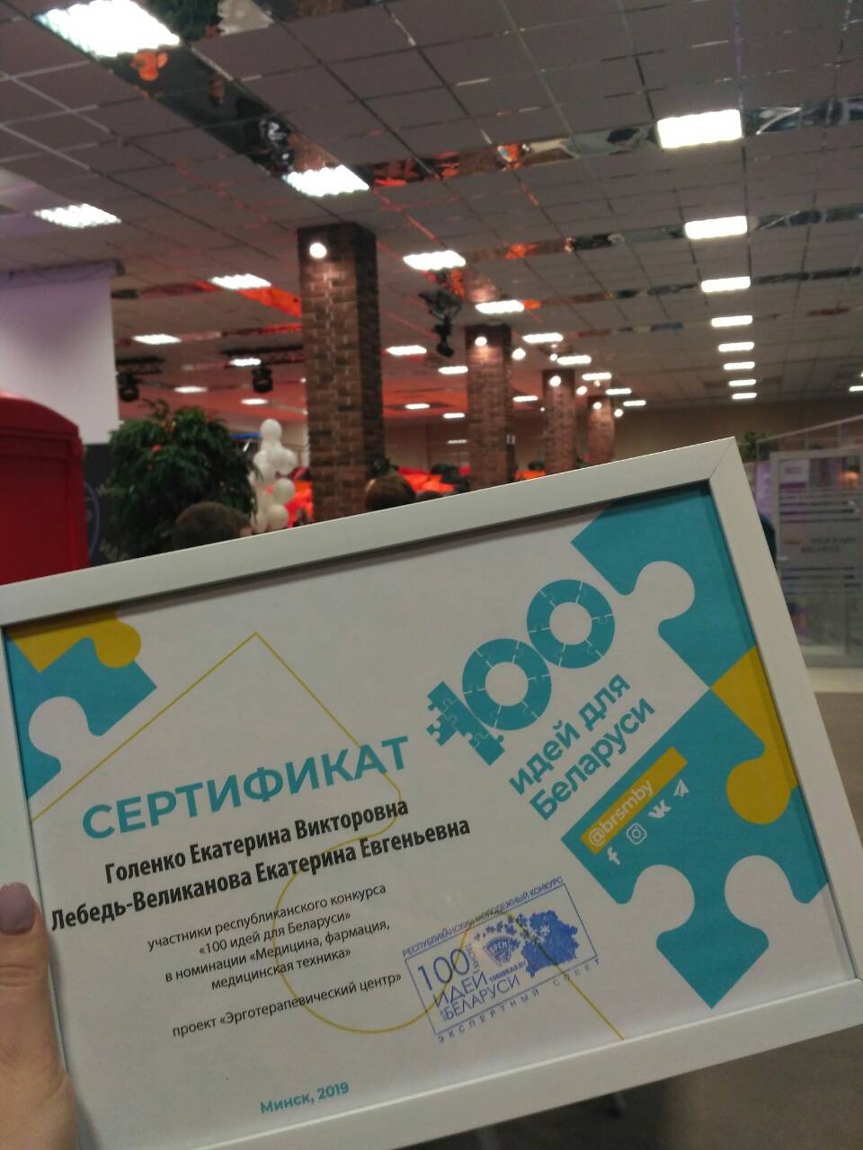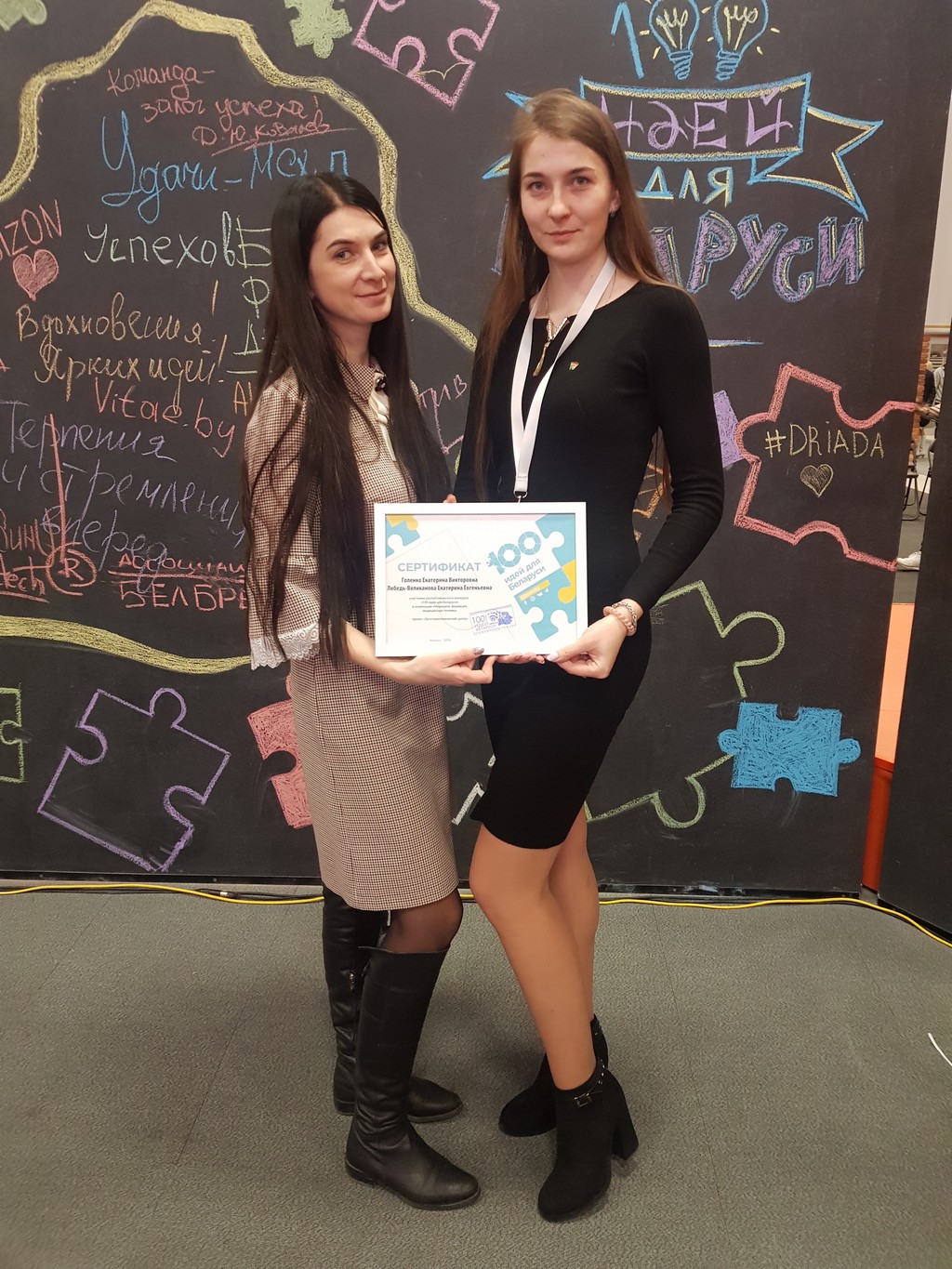 27 февраля 2019 года в городе Минске на базе бизнес-инкубатора Парка высоких технологий прошел финальный этап Республиканского конкурса «100 идей для Беларуси», организатором которого является Общественное Объединение «Белорусский Республиканский союз молодежи». В финале конкурса от факультета организации здорового образа жизни принял участие проект «Эрготерапевтический центр», авторы которого старший преподаватель кафедры оздоровительной и адаптивной физической культуры Е.Е. Лебедь-Великанова и студентка 4 курса гр. 15 ФРЭ-1 факультета организации здорового образа жизни Е.В. Голенко, идея проекта вызвала интерес экспертов конкурса. Всего по Республике Беларусь было представлено 1000 проектов по итогам 2018 года в 10 кластерах (энергетика, агропромышленные технологии и производство, медицина, фармация, медицинская техника и др.) и лишь 180 инновационных проектов со всей страны получили возможность представить свои разработки финале конкурса.