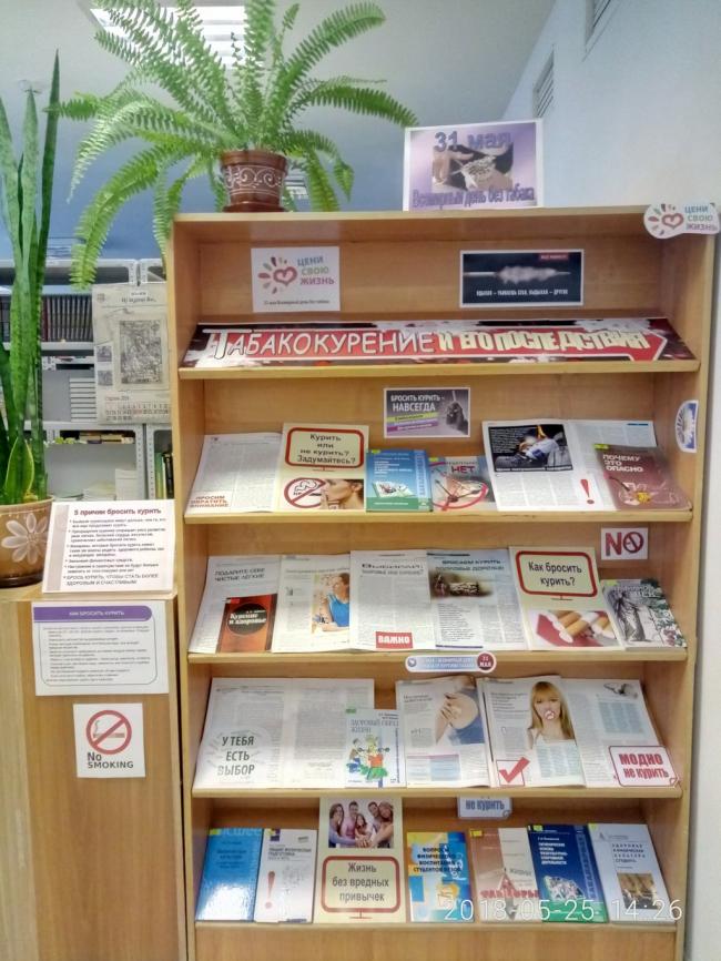 На абонементе учебной литературы в учебном корпусе №3 (к. 3214) экспонируется иллюстрированная книжно-журнальная выставка «Табакокурение и его последствия», которая, включает в себя книги и журнальные статьи о негативном воздействии табака и курения на организм человека, о способах борьбы с этой вредной привычкой.
