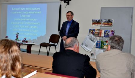 «Справедливости ради…» - таков лейтмотив творческой встречи, которая состоялась 29 апреля с проректором по АХР и строительству Анатолием Михайловичем Петровичем, автором документальной повести о войне. Встреча прошла в теплой, дружеской атмосфере. Анатолий Михайлович рассказал о боевом пути командиров отдельных подразделений Главного разведывательного управления Генерального штаба Красной армии, действовавших в годы Великой Отечественной войны на территории Белоруссии, поделился информацией по дальнейшему продвижению своего исследования о деятельности партизан и разведчиков в наших краях. На встречу был приглашен руководитель военно-исторического клуба «Поиск» Атанов Петр Сергеевич, который поблагодарил А.М. Петровича за его труд по увековечиванию памяти героев разведчиков и рассказал о деятельности клуба. Библиотека подготовила книжную выставку «Партизанское движение», где были выставлены книги из личной библиотеки Анатолия Михайловича и документы из библиотечного фонда.Спасибо всем, кто пришел на эту встречу.