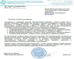 23 ноября 2019 года на базе универсального спортивного комплекса «Волна» проведен первый этап Кубка по образовательной робототехнике. В адрес декана факультета банковского дела поступило письмо от директора Ассоциации «Образование для будущего» с выражением благодарности студентам за активное участие в проведении данного мероприятия, волонтёрскую деятельность, ответственность и творческое отношение к своей работе.