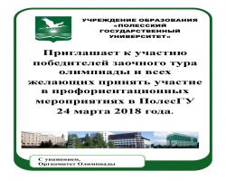 Полесский государственный университет приглашает победителей заочного тура олимпиады принять участие во втором (очном) туре Олимпиады по общеобразовательным и специальным дисциплинам.
