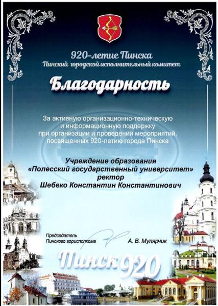 26 декабря 2017 года Полесский государственный университет был удостоен Благодарности Пинского городского исполнительного комитета за активную организационно-техническую и информационную поддержку при организации и проведении мероприятий, посвященных