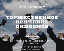 Приглашаем вас принять участие в торжественном вручении дипломов об окончании обучения выпускникам факультета экономики и финансов, которое состоится 28 июня в 15.00 и 30 июня в 15.00 в актовом зале первого корпуса.
