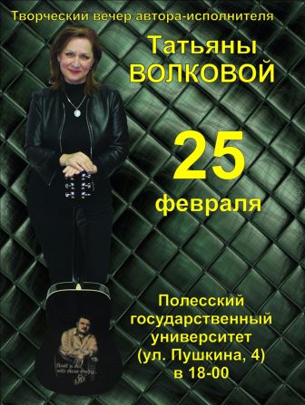 25 февраля в 18.00 по приглашению Полесского государственного университета состоится творческий вечер автора-исполнителя Татьяны Волковой