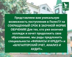 Представляем вам уникальную возможность поступления в ПолесГУ на СОКРАЩЕННЫЙ СРОК В ЗАОЧНОЙ ФОРМЕ ОБУЧЕНИЯ! Для тех, кто уже окончил колледж и хочет продолжить свое образование, мы рады предложить специальности «ФИНАНСЫ И КРЕДИТ» и «БУХГАЛТЕРСКИЙ УЧЕТ, АНАЛИЗ И АУДИТ» .