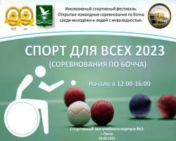 30 сентября 2023 года в спортивном зале учебного корпуса №3 с 12.00 до 14.00 пройдет инклюзивный фестиваль "Спорт для всех".