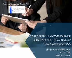 26 февраля 2025 года в 16.40 в аудитории 308 (уч. Корпус №1) Бизнес-центр ПолесГУ организует стартап-семинар на тему: «Определение и содержание стартап-проекта. Выбор ниши для бизнеса». В рамках семинара вы узнаете: