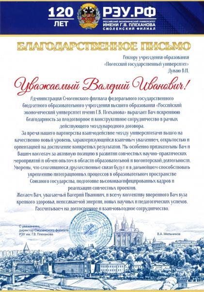 За плодотворное и конструктивное сотрудничество в рамках действующего международного договора, обмен опытом в области образовательной и волонтерской деятельности, укрепление интеграционных процессов в образовательном пространстве Союзного государства, а также значительный вклад в популяризацию здорового образа жизни среди студенческой молодежи УО «Полесский государственный университет» удостоен благодарности администрации Смоленского филиала федерального государственного бюджетного образовательного учреждения высшего образования «Российский экономический университет имени Г.В. Плеханова».